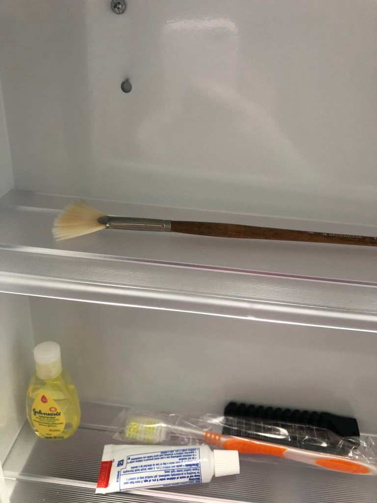 Here’s the thing… I told NO ONE that I had hidden the paint supplies on the top shelf of his storage closet, out of sight and out of reach. I was there every day, so I would’ve noticed that brush in the cabinet. And here’s the REALLY interesting thing… This brush was NOT among the group of brushes I brought over that day.
